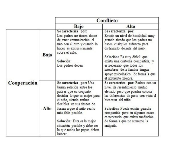 A pesar de que la custodia compartida sea la situación perfecta como ya fue abordado anteriormente en la actividad 6, de acuerdo a diferentes niveles de conflicto y de cooperación la solución óptima para la custodia de un niño puede variar y las posibles soluciones se encuentran resumidas en la siguiente tabla ya vista anteriormente: