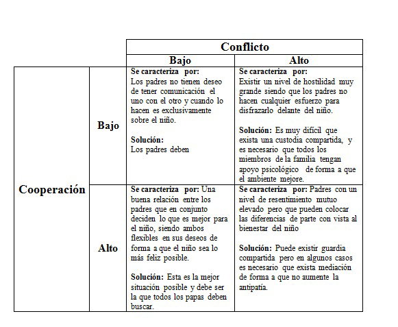 Complementando la información anterior, Camara y Resnick (1988) dan las posibles soluciones óptimas para situaciones en que existe una separación de la pareja y es necesario saber cuál la forma ideal de decidir la custodia de los niños.